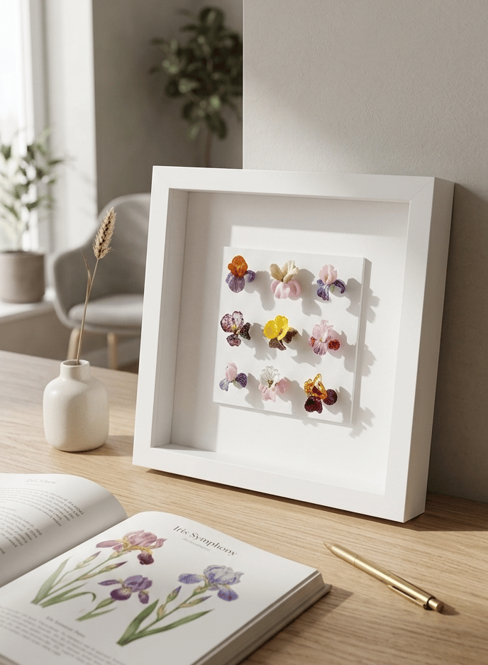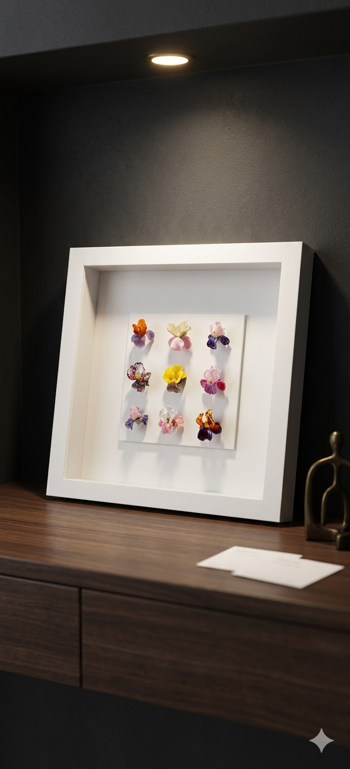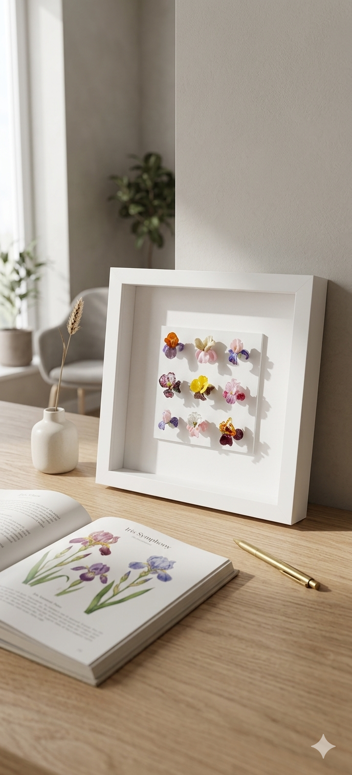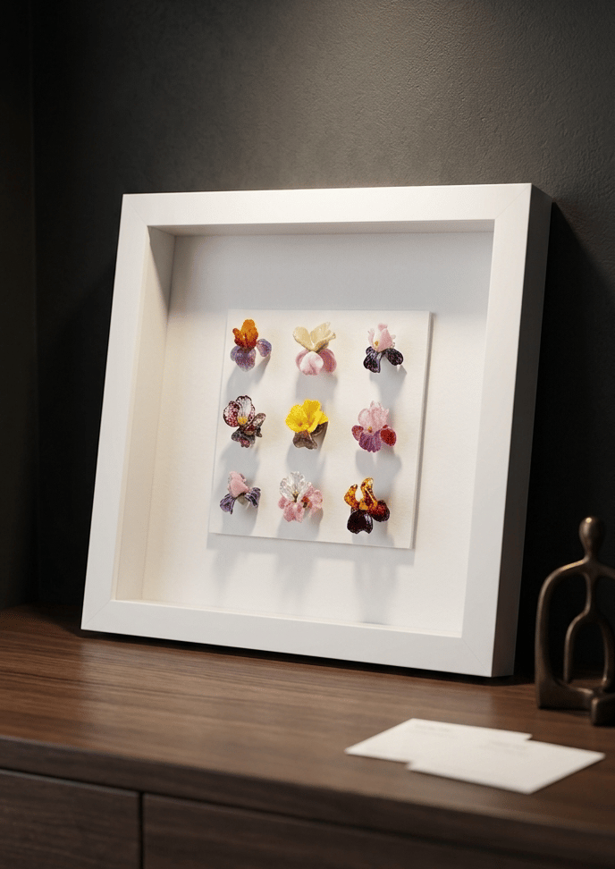 Every iris in this frame is a standalone masterpiece; no two petals are identical, and no two curves repeat. The mounting process is equally demanding, requiring manual precision to ensure each flower sits perfectly within its designated space in the symphony.
